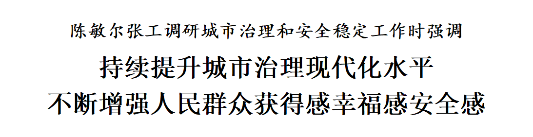 陈敏尔、张工在调研中强调,要认真学习贯彻习近平总书记在中央城市工作会议上的重要讲话精神,深入落实习近平总书记视察天津重要讲话精神,践行人民城市理念,强化党建引领基层治理创新,深化大城细管、大城智管、大城众管,着力提升城市治理现代化水平,不断增强人民群众获得感、幸福感、安全感。围绕筹备上合组织峰会,在周全安全上下功夫,强化问题导向、目标导向、结果导向,提升执行力,把握时度效,落实工作方案,完善应急预案,健全工作体系,优化指挥调度机制,全链条推动各项任务有序开展。坚持点线面网相结合,抓好社会面整体防控,强化风险隐患源头治理,建好管好用好综治中心,发展壮大群防群治力量,加强网格化服务管理,深化矛盾纠纷多元化解,完善城市运行保障和应急管理体系,严格落实安全生产责任制,有力保障全市域、全时段、全要素安全。深化道路交通综合治理,加强交通组织和疏导,持续提升交通态势感知力、交通拥堵疏解力、交通事件反应力,确保道路交通安全畅通。提高信访工作法治化水平,完善思路举措,注重分类指导,提升信访干部的群众工作能力、法律政策水平,增强信访工作实效,更好维护群众合法权益、服务全市工作大局。