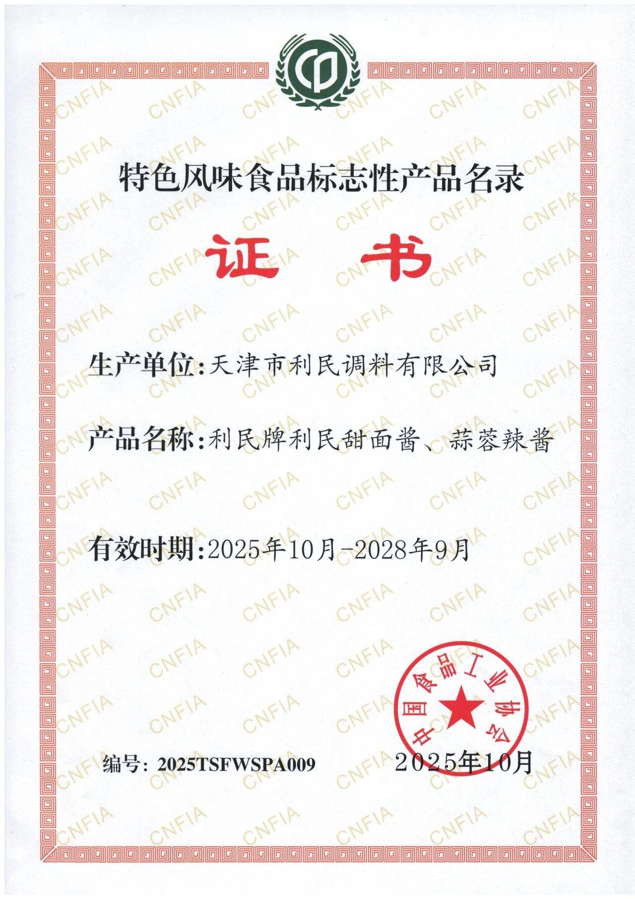近日,利民公司喜讯频传,“利民”品牌获评2024-2025年度天津市首批消费名品企业品牌称号,旗下经典产品利民甜面酱、蒜蓉辣酱成功入选中国食品工业协会认定的第二批“特色风味食品标志性产品名录”,品牌发展与产品实力获得市场与行业的高度认可。