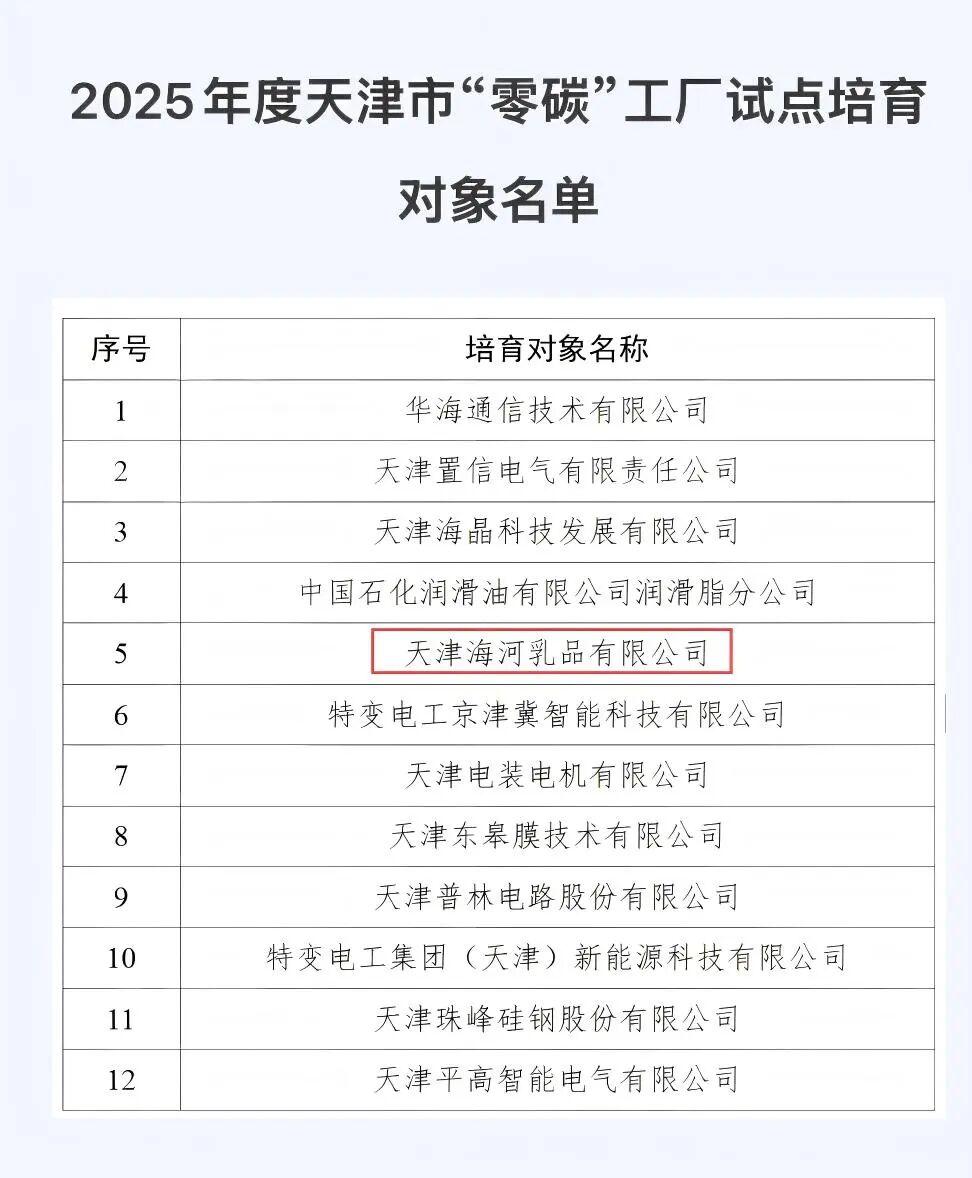 近日,天津市工业和信息化局公布2025年度“零碳”工厂试点培育对象名单。海河乳品公司凭借在绿色生产、能源结构优化及低碳创新领域的卓越实践与前瞻布局,经过多轮严格筛选,从众多申报企业中脱颖而出,成功入选“零碳”工厂试点培育对象名单,彰显了中华老字号乳企在绿色转型道路上的先行姿态。