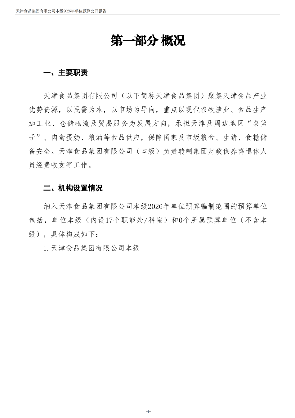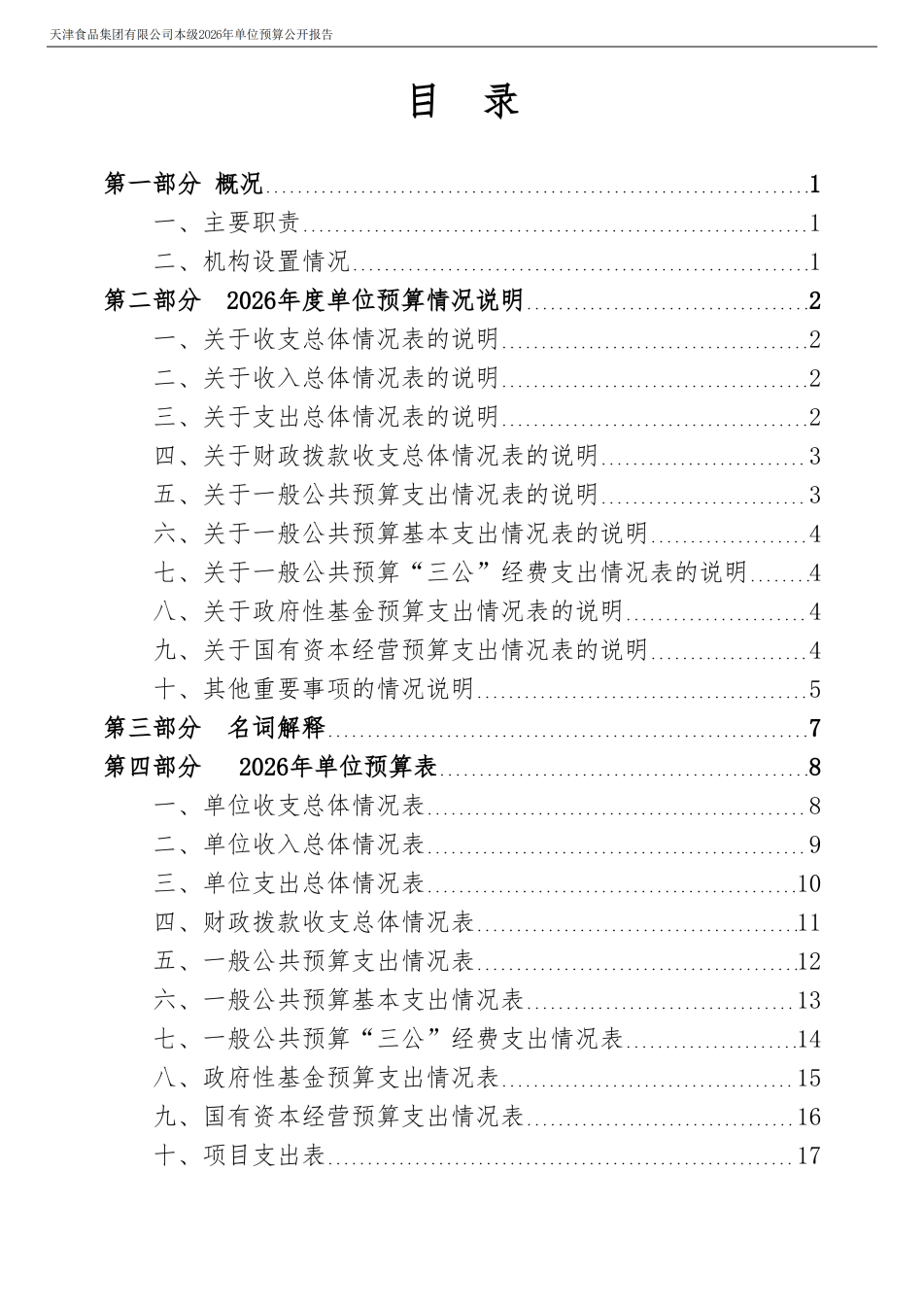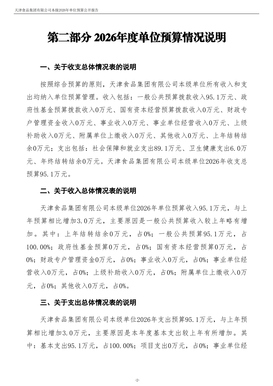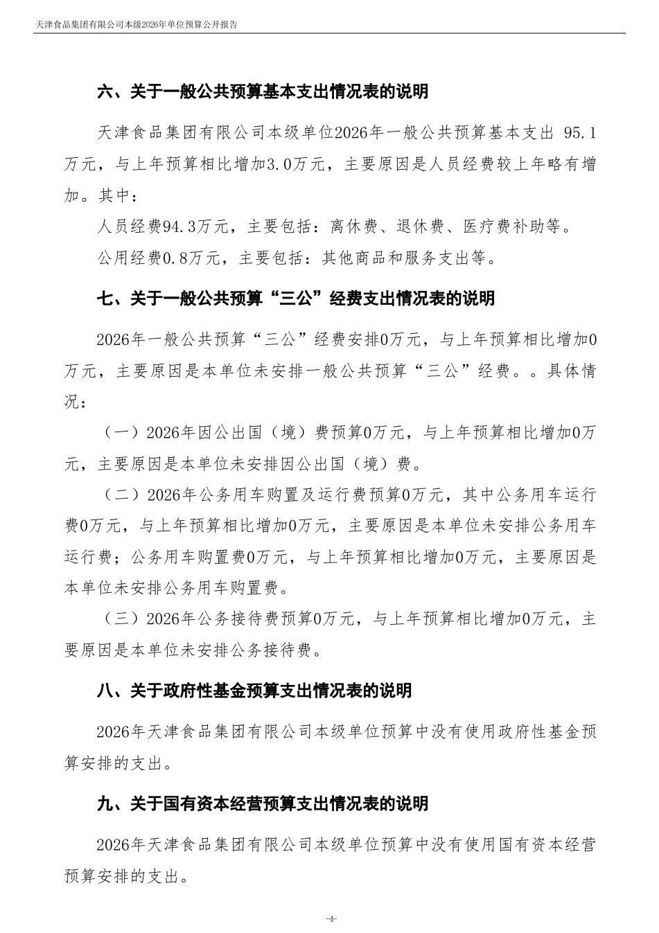 天津食品集团有限公司本级2026年度单位预算