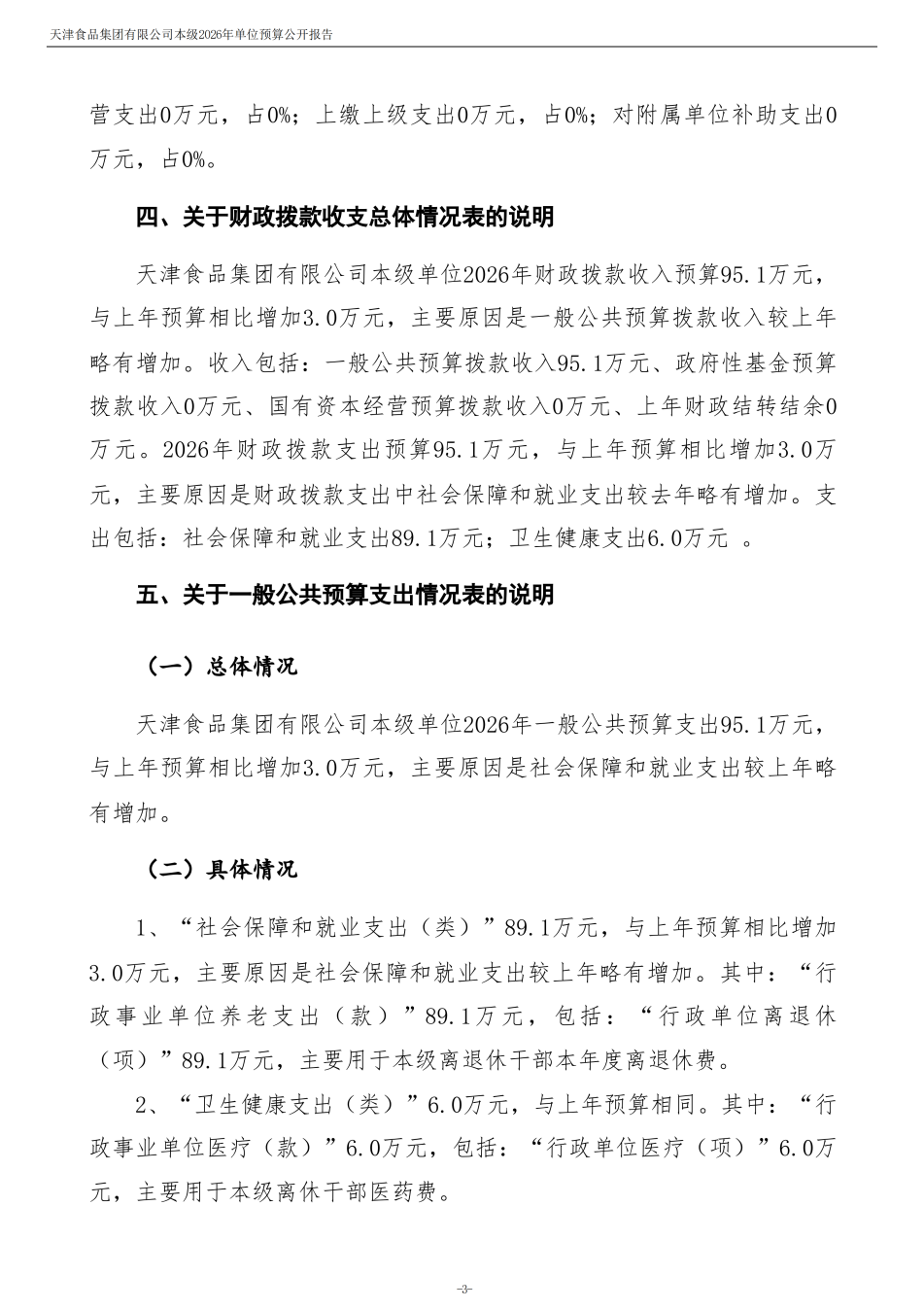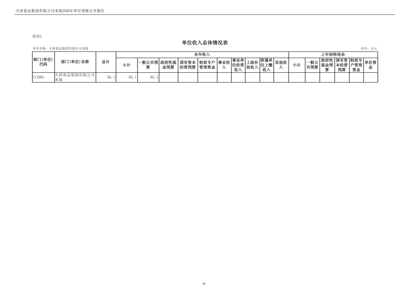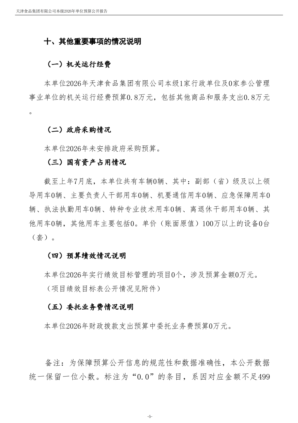 天津食品集团有限公司本级2026年度单位预算
